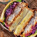 Homemade toast topped with fresh made crispy fried fish cutlet, sunny side up, fresh vegetables & eight sauce 黄油吐司猪肉松荷包蛋新鲜蔬菜自制马铃薯泥