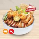 Rich curry with chee cheong fun, topped with char siu, pork skin, spiced meatballs, and fried beancurd , finished with our fiery special chili.
