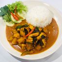 Delicate fish slices served with fragrant rice, drizzled in a rich, zesty Thai sauce.