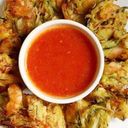 Crispy shrimp fritters served with a zesty dipping sauce, perfect for a delightful snack.