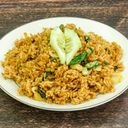 Basic fried rice cooked with chilli paste, fried tofu, anchovies, leafy greens and lettuce