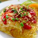 Fried rice wrapped in omelette with dash of sauce
