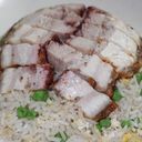 A savory dish combining tender chunks of roasted pork with seasoned fried rice and colorful vegetables