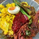 Nasi, bendi, kobis mamak, telur masin & kuah campur