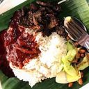 Steamed coconut rice with tender beef rendang, served with sambal, peanuts, and anchovies.