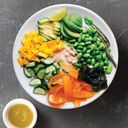 Brown rice with edamame, carrot, cucumber, black bean, mango, crushed nuts, avocado & avocado lemon dressing