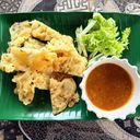 Cucur udang rangup di luar, lembut di dalam. Dihidang bersama kuah kacang pekat pedas manis.