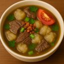 Noodles in a savory beef soup with comforting flavors. For reference only.
