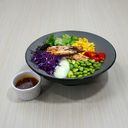 Salmon, Cherry Tomatoes, Edamame, Corn, Egg, Lettuce, Purple Cabbage, Seaweed, Rice