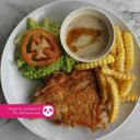Hot selling. Chicken chop yang disalut dengan tepung roti dan digoreng garing dan dihidangkan dengan sos black pepper dan fries