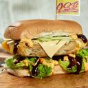 Oblong-shaped cheese burger with special ingredients, offering a rich and cheesy experience