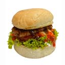 Savory beef burger topped with fresh vegetables and zesty sauce, served on a toasted bun.