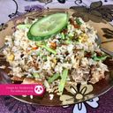 Flaky flatbread with spiced eggs and fresh vegetables, served with tangy dipping sauce.