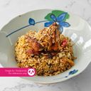 Traditional Malaysian fried rice dish cooked with shallots, garlic, chili, anchovies, and vegetables served with fried chicken
