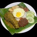 Fragrant coconut rice served with spicy sambal, crispy anchovies, peanuts, and a boiled egg.