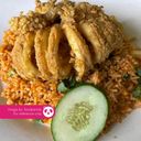 Fragrant fried rice topped with succulent grilled chicken, fresh vegetables, and a hint of spice.