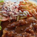 Savory fried rice topped with crispy chicken chop, served with a side of tangy sauce.