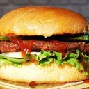 Mixed chicken and beef patty wrapped with egg and bun with chilli sauce, mayonnaise, fresh lettuce, onion and cucumber.