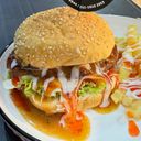 Juicy grilled burger topped with fresh vegetables and savory sauces, served on a toasted bun.