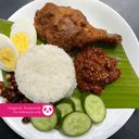 Nasi lemak wangi bersama ayam goreng rangup, sambal pedas, kacang, ikan bilis & telur rebus