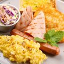 Combo with grilled chicken chop, sauteed mushroom, sausage, ham, hash brown, scrambled egg, garlic butter toast & coleslaw