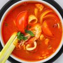 Deliciously hot, sour and spicy soup with fresh seafood, chicken, beef, tomatoes and celery