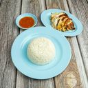 Chicken Thigh Rice is a dish featuring juicy, tender chicken thighs served over steamed rice, often accompanied by a flavorful sauce or seasoning to enhance the savory taste of the chicken.