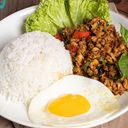 Spicy stir-fried chicken with basil, chili, and vegetables, served over jasmine rice.