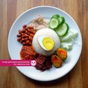 Beef cooked in rich flavorful gravy. Served with fragrant fluffy rice, fried anchovies, sambal, perfectly toasted peanuts and sliced cucumber