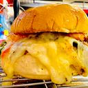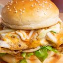 Juicy double chicken burger topped with melted cheese, fresh lettuce, and tangy sauce on a bun.