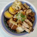 白饭/白粥,卤豆腐,卤蛋,卤滑鸡腿(雞腿/二度),咸菜