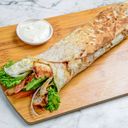 Marinated chicken with fresh vegetables, fries, garlic sauce, turkish sauce wrapped in pita bread