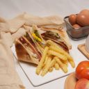 Layered sandwich with a choices of bread served with beef strip, egg, cheese, lettuce, cucumber, tomato & french fries