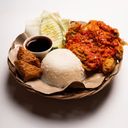"Nasi, Ayam, Tauhu Tempe Goreng, Timun, Kobis, Sambal Gepuk & Kicap Manis"
