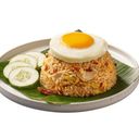 Fried rice with dried chili for spicy kick, served with egg, cucumber, spring onion and chicken.
