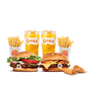 Two signature flame-grilled beef patties topped with a simple layer of melted American cheese, crinkle cut pickles, yellow mustard & ketchup on a toasted sesame seed bun.
