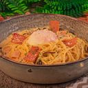 Spaghetti pasta, lala shells, prawn, garlic, carrot, mushroom confit, cherry tomatoes, capsicum green, homemade chili flakes & parmesan cheese.