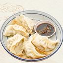 Crispy pan-fried dumplings with a savory filling, offering a satisfying crunch, flavorful bite & a classic snack