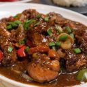 Tender chicken simmered in a savory black bean sauce, garnished with scallions and sesame seeds.