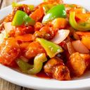 Tender chicken in a tangy sweet and sour sauce, served with vibrant vegetables.