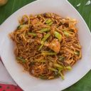 Fried yellow mee with chili paste, soy sauce, crunchy fritters and leafy greens