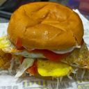 Fish patty in a bun with egg, cheese, shredded lettuce and sauces