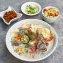 Beef meatball mix with miced tendon-fried tauhu, fried pangsit-bihun-beef broth-sambal