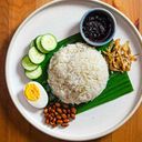Nasi Lemak, sambal, telur rebus, kacang goreng, ikan bilis, timun.