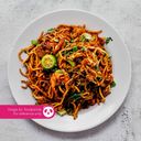 Fried noodles with chicken in a savory, slightly spicy flavor. For reference only.