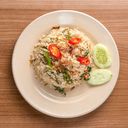 Fried rice with chicken and salted fish with leafy greens and birds eye chillies