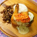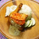 nasi, ayam, telur mata, kobis goreng, pedal, tahu, tempe, timun dan sambal