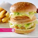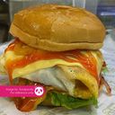 Double egg patties,fresh vegetables, and signature sauce on a bun.