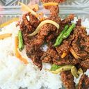 Nasi Putih, Daging Kicap berlada, sambal belacan dan sup.