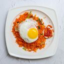 Nasi goreng dengan potongan ayam, sayuran paprik & diproses dengan bumbu khas untuk rasa yang seimbang